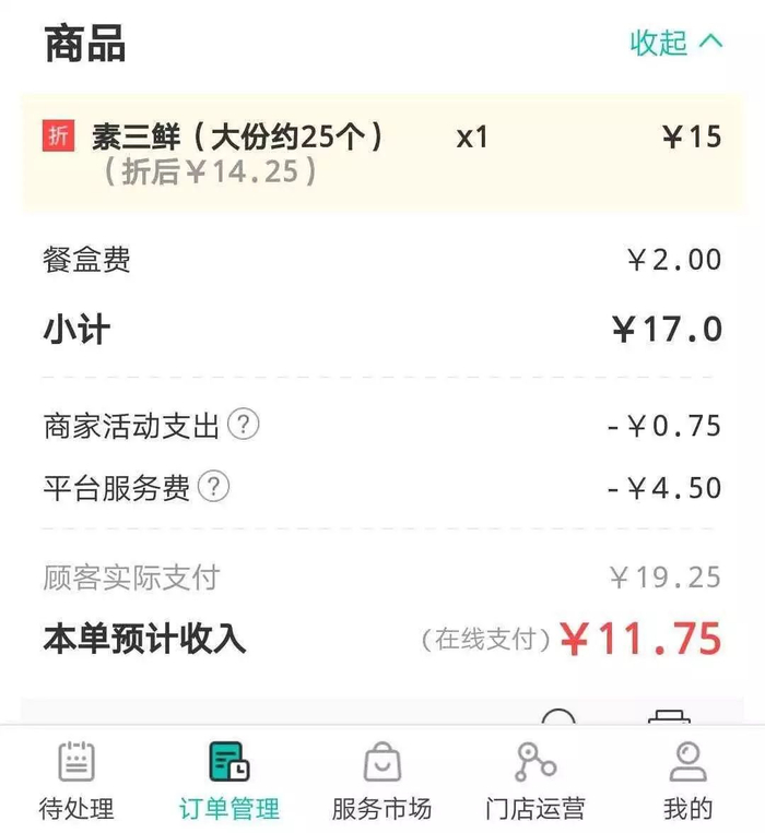 即使这样,还不挣钱。在元昇的账单上,这份15元的水饺加2元餐盒费共计17元,在此基础上商家垫付0.75元的优惠,最后顾客实际支付的费用为19.25元(17元-0.75元+3元配送费)。美团外卖平台在这笔订单中收取的服务费为4.5元(菜品分成为21%,最低为4.5元),最后到元昇手里的,只有11.75元。“我们客单价在20元左右,这样算下来平台在我们每单外卖中的分成比例为22.5%。”元昇说。
