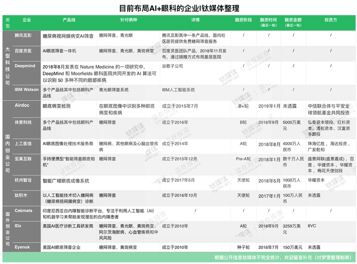 据钛媒体不完全统计,目前有十几家企业布局AI眼底产品线,其中包括Deepmind、IBM Watson、腾讯、百度等大型科技公司,也包括国内外创业企业。