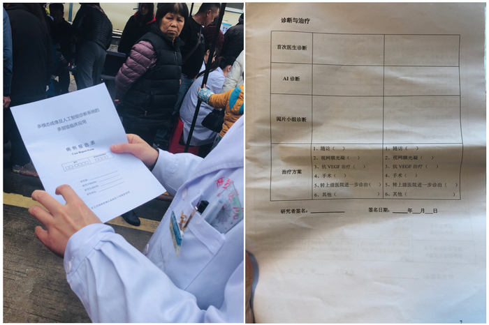 钛媒体注意到,现场参与义诊的人手里拿着一份名为《多模态成像及人工智能诊断系统的多层级临床应用》病例报告表,其中“诊断与治疗”这一项中有“首次医生诊断”、“AI诊断”、“阅片小组诊断”三个纬度。
