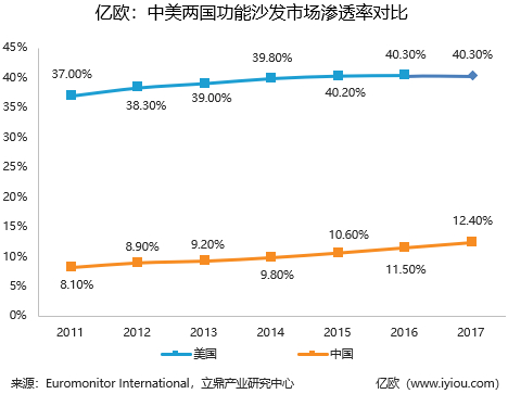 目前,我国功能沙发的渗透率接近15%,与美国、日本等发达国家相比仍然有较大的差距,根据数据显示,2018年美国功能沙发的市场份额达到40.3%。亿欧认为在消费升级趋势下,未来功能沙发的市场空间有望持续扩大。