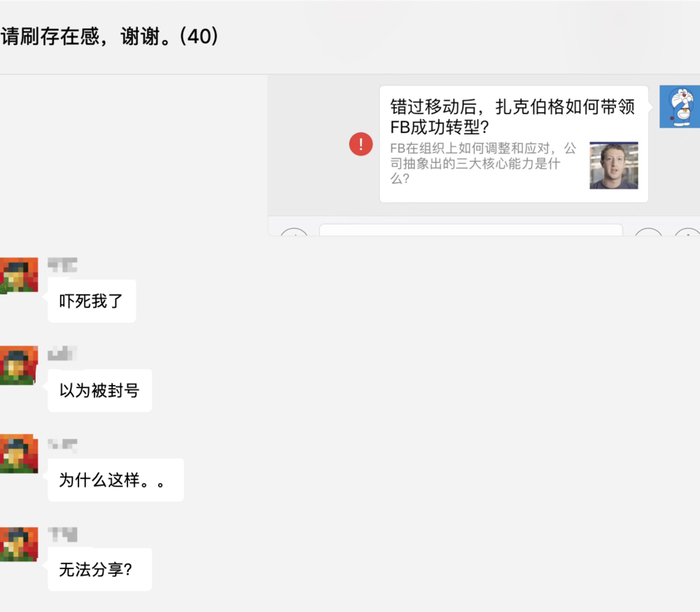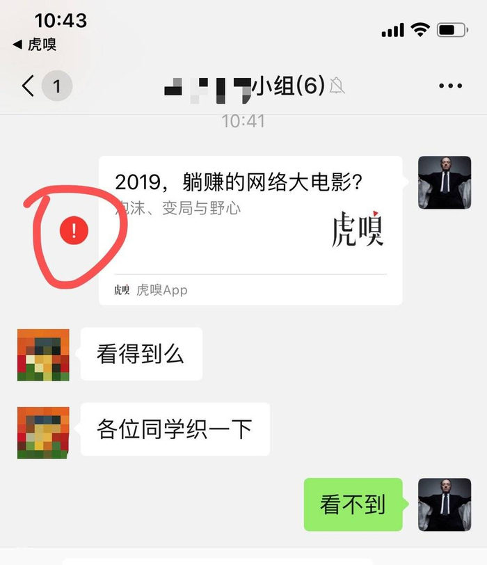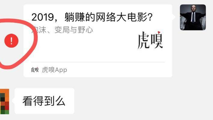 10 : 30的时候,当我把方可成写的一篇《我为什么要写<搜索引擎百度已>》分享到虎嗅编辑群,显示无法发送成功,当时我以为是这篇文章敏感,后来又从虎嗅APP上分享了一个文章链接到群里,依然是红色感叹号。