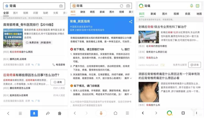 作为一个上班族,久坐会遇到头痛、背痛的一些小问题,我们就以经常出现的“背痛”为例,来看看三家的搜索结果是什么。