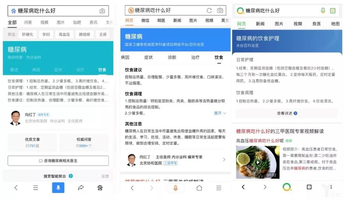 但疾病卡片的下面却存在不小差异:在百度结果页下方,陆续出现了三九养生堂、爱聊八卦的小姐姐的百家号文章;搜狗搜索“糖尿病”疾病卡片下方汇集的是来自三甲医院专家给出的饮食分析,包括文章、语音等形式;360搜索中也同样汇集了来自三甲医院专家的解读,与搜狗不同的是,其更多是视频讲解。