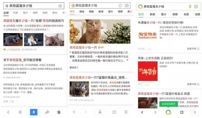 我们先来试试一些生活百科话题。比如基哥对英短蓝猫非常感兴趣,分别用百度、搜狗、360搜一下“英短蓝猫多少钱”,来看看结果如何。