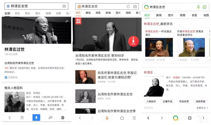 我们就用作家“林清玄去世”为关键词,在三个搜索引擎上进行搜索,看看搜索结果如何。