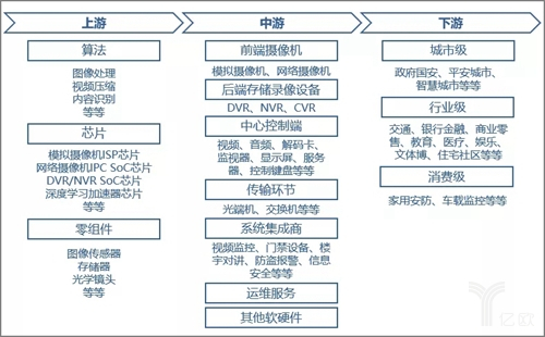 智慧安防产业链包括上游零组件供应商、算法和芯片供应商等;中游为软硬件设备设计、制造和生产环节,主要包括前端摄像机、后端存储录像设备、音视频产品、显示屏供应商、系统集成商、运营服务商等;下游为产品分销及终端的城市级、行业级和消费级客户应用。上游零部件供应商,代表企业有华为海思、索尼、中星微,还有视频算法提供商Object Video等;中游软硬件供应商、系统集成商的主力厂商包括海康、大华等。下游为终端客户,主要涉及到政府、公共行业、民用行业等。