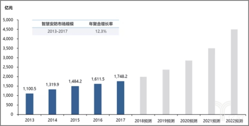 中国智慧安防市场迅速扩张,未来发展潜力巨大在新兴技术迭代更新的推动下,智慧化成为安防行业发展的主流形式,智慧安防逐渐成为安防企业转型升级的方向,在安防行业的占比越来越大。另外,“一带一路”战略、平安城市、智慧城市、智能交通等一系列重大项目的开展,有力促进了智慧安防系统产业的发展。2013年至2017年之间,智慧安防的市场规模由1,100.5亿元增长至1,748.2亿元,年复合增长率为12.3%。