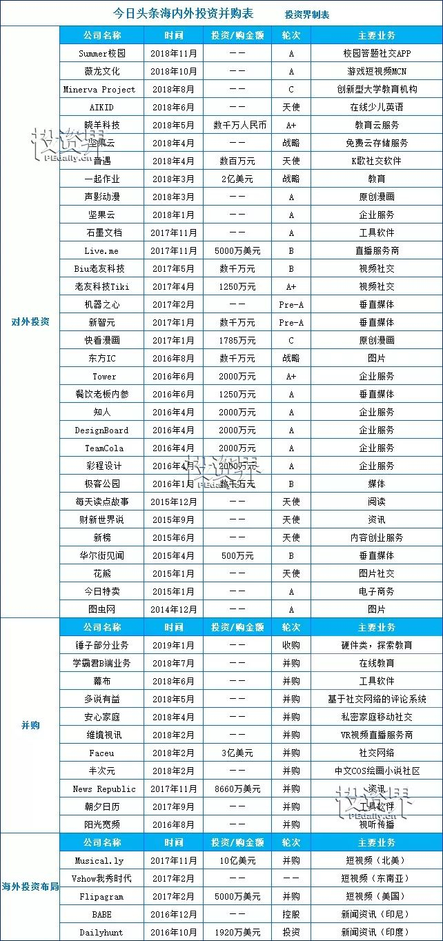2018年1月,今日头条还成立了一家规模2亿元的内容投资基金,投资早期新媒体内容创业项目,并优先关注短视频项目。2018年底,很多机构都在储存粮食准备过冬的时候,却有外媒爆料字节跳动打算组建自己的首支100亿元(约为14.5亿美元)的风险投资基金,将主要用于投资人工智能和内容领域的优质企业。