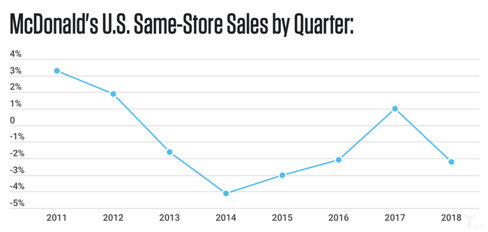 相比去年,麦当劳的可比顾客量下降2.2%。在过去六年里,这是麦当劳——这家总部位于芝加哥的汉堡巨头——现有门店的第五次顾客量下滑。在此期间,麦当劳的可比顾客量总共下跌了12%。