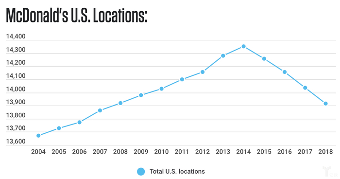 与此同时,麦当劳也关闭了一些门店。2018年麦当劳减少了122家门店,这是自2009年以来麦当劳的门店数第一次低于14000家。在2014年的巅峰时期,麦当劳餐厅数量达到14350家,从那以后其门店数已经缩水3%。