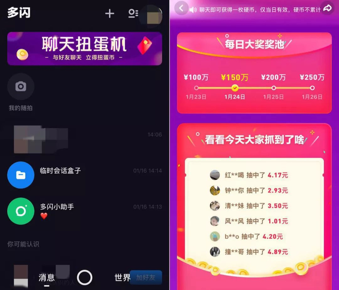 在获得支付牌照之后,如何推广是一个重要挑战。此前,微信借春节红包、支付宝借集五福的玩法已经证明了红包或现金激励在支付产品推广上的巨大作用,多闪的“亲密聊天季”抽奖活动无疑借鉴了微信和支付宝的经验。