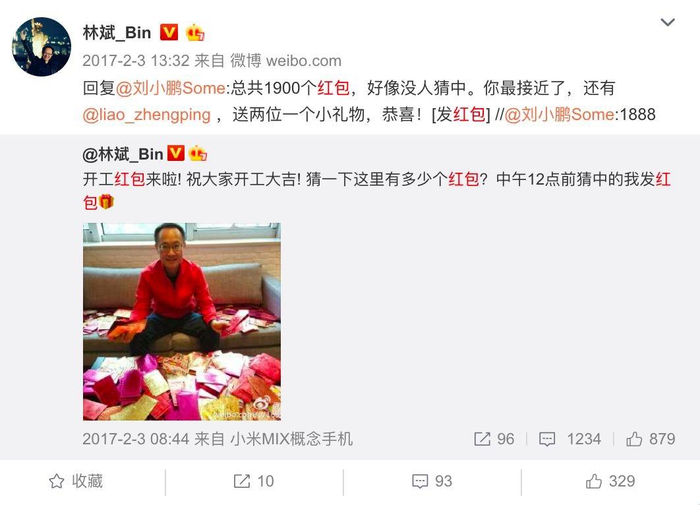 2017年大年初七,小米总裁林斌在微博上晒出了开工红包,金色、红色各种红包齐聚,好不热闹。