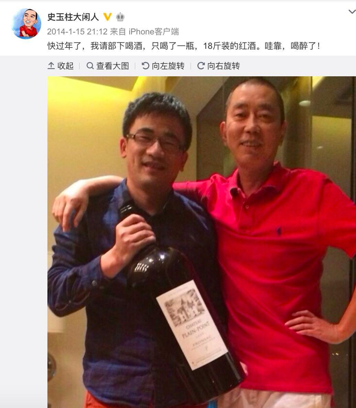 与其他几位老板相比,史玉柱的犒劳方式显得直接又朴素——请喝酒。2014年1月15日,当天正是小年夜, 史玉柱发微博称请员工喝了一瓶18斤装的红酒,喝醉了。在微博中,史玉柱与这位部下勾肩搭背甚是亲昵。看来这次春节前的交心,史玉柱喝得很尽兴。