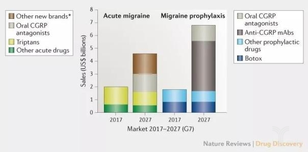 2017年,偏头痛的七个主要市场(G7国家:美国,法国,德国,意大利,西班牙,英国和日本)大约合计为38亿美元,其中急性偏头痛占50%以上。该市场在CGRP靶向药物的刺激下,未来10年预期将有大幅增长,规模可超110亿美元,而预计CGRP靶向药物2027年的销售额可超65亿美元。