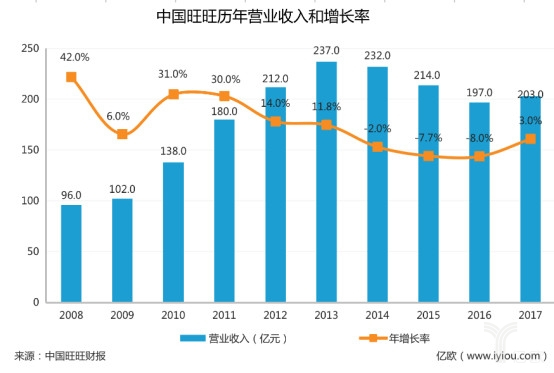 然而盛衰各有时。2014年旺旺初显颓势,根据财报显示,2014年旺旺的总收益为232亿元,同比下降2.0%,利润为37.3亿元相较2013年下跌9.7%。当时旺旺集团在报告中给出的理由是,因农历春节日期不同造成会计期间可销售天期较短,故利润稍降。