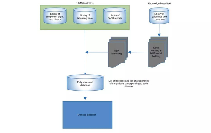 首先提取数据,基于深度学习构建NLP模型,对数据进行语义分析,其次将数据进行结构化,最后对这些完全结构化的数据库用疾病分类器处理,预测临床诊断。