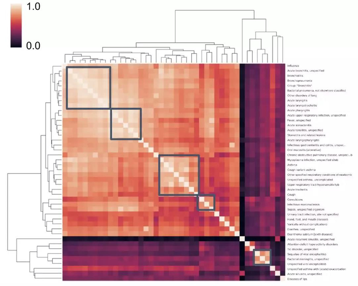 在一些病例中,系统使用相关的ICD-10代码进行聚类诊断,说明具备检测与人类定义的分类系统一致的临床特征的趋势。但是,另一些时候,系统会将相关类型的诊断分为一类,但不包括该类别中的其他非常类似的诊断。比如将“哮喘”和“咳嗽变异性哮喘”分到同一组中,但该类中不包括“急性哮喘恶化”,该病与“急性鼻窦炎”组合在一起。在许多情况下,即使没有任何定向标记或分类系统,系统也成功建立了相关诊断的广泛分组,这表明我们开发的临床特征成功学习了建模和诊断的条件之间的关键的相似性和差异。