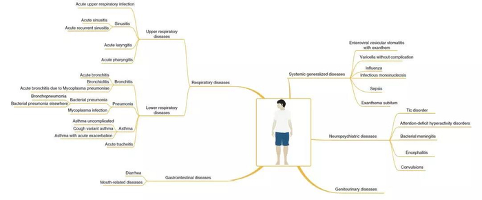 基于器官的方法,首先将器官系统按照大类可以划分为5类,分别是呼吸系统疾病、系统性全身性疾病、神经精神疾病、泌尿生殖系统疾病、胃肠道疾病。然后将每个大类再细分成器官子系统,甚至更具体的诊断组。