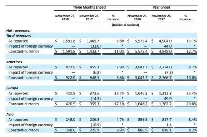 根据李维斯公布的业绩,截至2018年11月25日,Levi Strauss& Co.集团实现了56亿美元的营收,同比增长14%。其中,集团直营零售销售额同比增长18%,批发渠道销售额同比增长11%。同时,集团净利润也从2.814亿美元增至2.831亿美元。