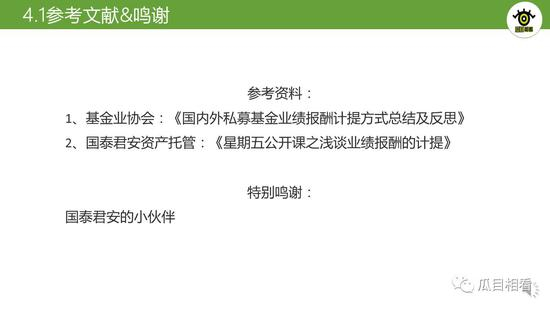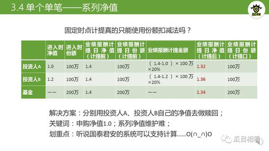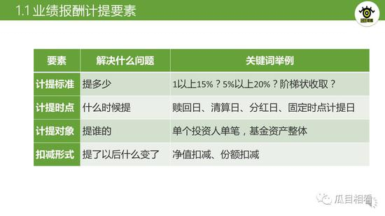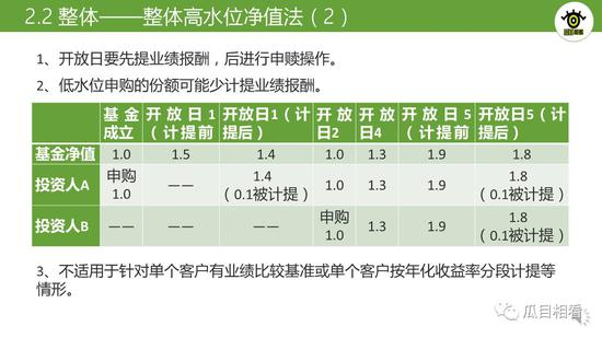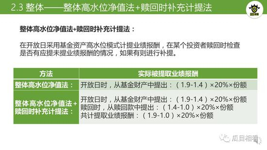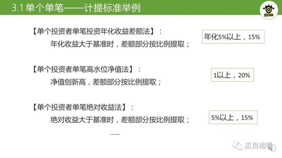 这次的PPT说,讲的就是私募基金业绩报酬计提的逻辑,以单个单笔和基金资产整体两条主线,搭配各种计提时点,包含了常见的六种业绩报酬计提的方式。当然,关于基金累计净值、基金业绩报酬提取的计算公式等问题,本PPT并没有详细地提到,有待于以后的介绍和探讨。