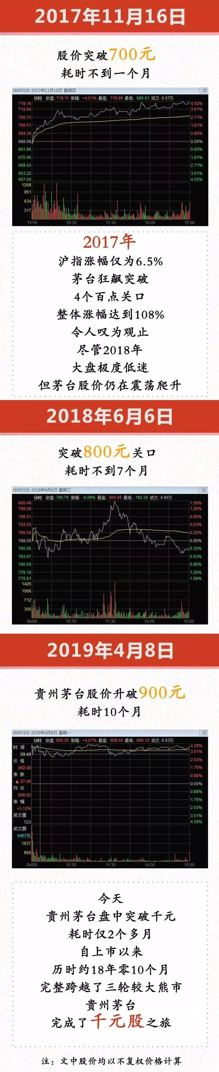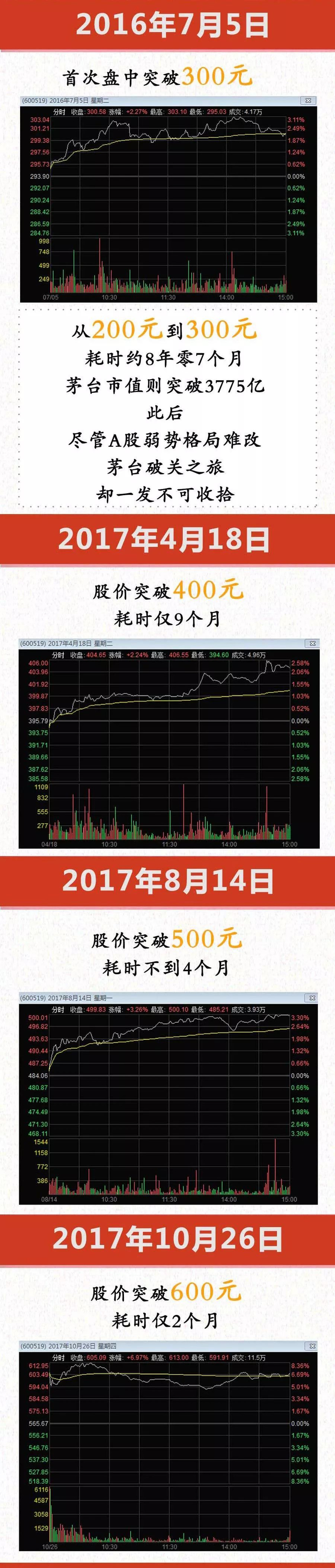 18年零10个月,跨越了三轮较大熊市,股价从500元到600元,耗时仅仅两个月!贵州茅台是的破关之旅,可谓一发不可收拾!小编给您一图梳理↓↓
