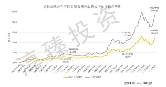 可以明显看到两条净值曲线的差异,如果不考虑业绩报酬的收取模式而仅以基金净值曲线评估其业绩表现,可以预见会造成较大的失真。