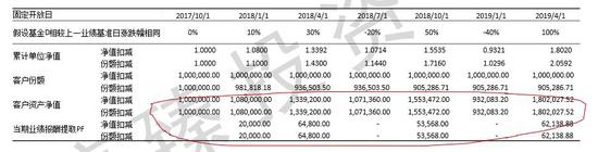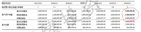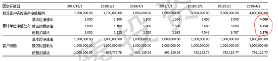 可以清晰地看到在相同客户投资收益的假设下,不同收取模式下客户赎回时基金累计单位净值公布如上表红圈标示是不同的,公布的净值名义上增长率从高到低依次为份额扣减法、赎回时提取法、高水位净值法。