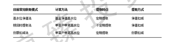 种收取模式。实操中受限于技术障碍,如果选取单客户单笔高水位并定期提取时,提取方式只能选择份额扣减;如果选取单客户单笔高水位净值扣减时,提取时点无法支持定期提取。而目前市场上常见的三种收取模式说法是大家约定俗成的简称,它们代表的完整内容如下表所示。