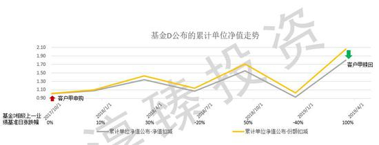 而反应到基金公布的累计单位净值上,份额扣减比净值扣减容易形成虚高的假象。仍以上表为例,基金D在投资端资产的涨跌幅完全一样,但体现在公布的基金净值表现上,会得到如下图所示的效果。
