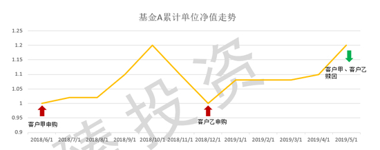 客户甲于2018年6月1日申购100万元并于2019年5月1日全部赎回;客户乙于2018年12月1日申购100万元并于2019年5月1日全部赎回。