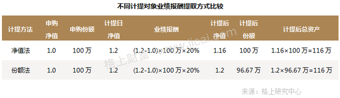 值得注意的是,无论是净值法还是份额法,均基于绝对收益,理论上讲,若基金有盈利,采用哪种计提方式没有太大区别。不同基金具体的提取方式在基金合同中有明确的条文展示计算方法。