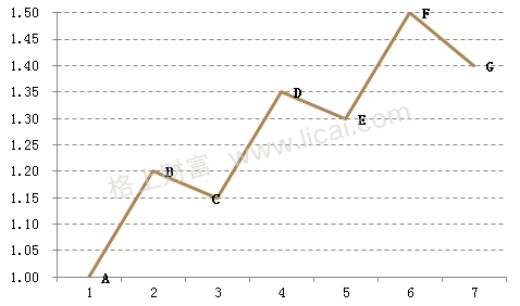假设某只基金的历史走势如下,A为基金成立点,B、D、F为合同中规定的业绩报酬提取点: