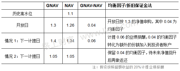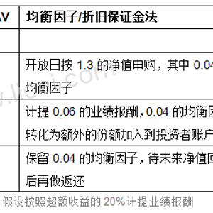 该方法下,基金管理人针对基金资产计提业绩报酬,同时针对单客户进行账户调整以实现不同时点进入的投资者的公平性,调整项称为“均衡因子/折旧保证金”。