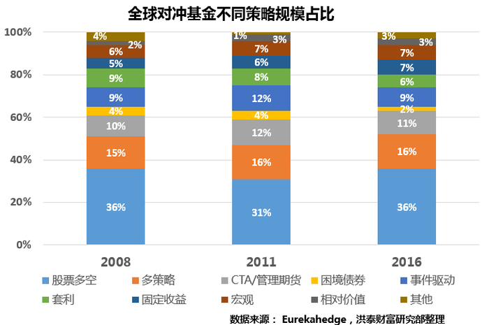 根据Eurekahedge统计数据,事件驱动策略管理的资金规模约占对冲基金总资产的10%左右,份额占比排名第四,仅此于CTA/管理期货策略。也有研究将困境债券策略归类为事件驱动策略,在这种分类标准下,事件驱动策略管理资金规模超过CTA/管理期货策略,是全球排名第三的对冲基金策略。