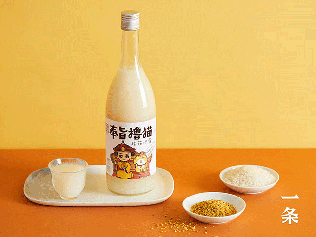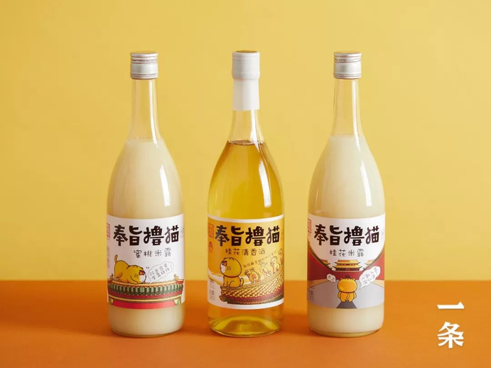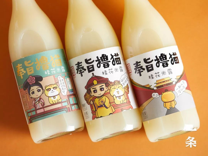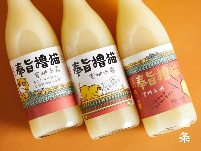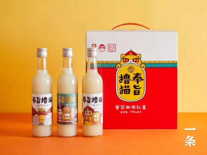 它是来自故宫酒文化的“奉旨撸猫”系列米酒,有桂花味、蜜桃味。