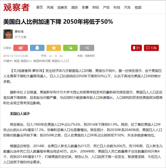 而白人的减少,似乎也是美国的必然趋势。《观察者》上的一个研究说到,到了2050年,在全国范围内,美国白人人口都要不足一半了。