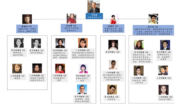 澳博控股为家族企业,前任主席兼创始人为何鸿燊先生,何家家庭成员众多,关系复杂。