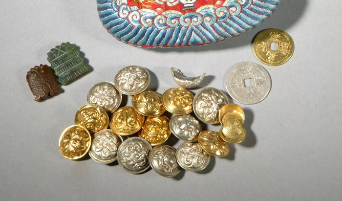 皇帝馈岁用的荷包,有着精致的刺绣,里面装着各色金银元宝、玉石八宝、钱币,真有那么点压岁钱的意思。