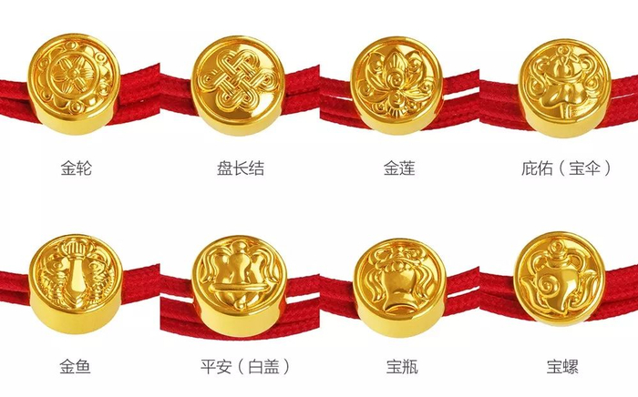 象征着佛教威力的八种宝物:金轮、宝螺、宝伞、白盖、金莲、宝瓶、金鱼、盘长结。