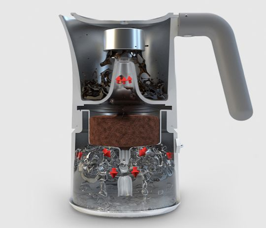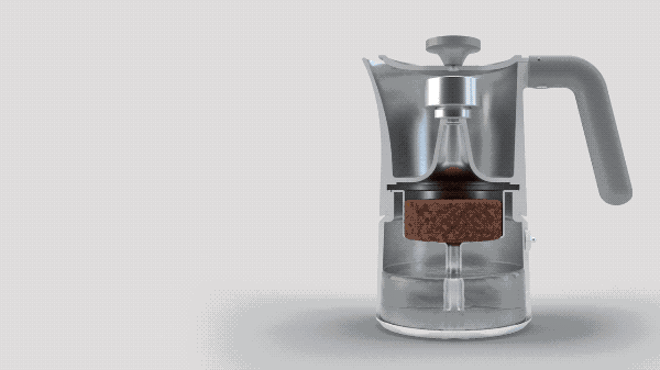 高气压将最底部的热水“压”过中部的咖啡粉粉槽,热水透过粉槽滤网萃取咖啡,并将压好的咖啡继续“挤压”到上层的壶里。