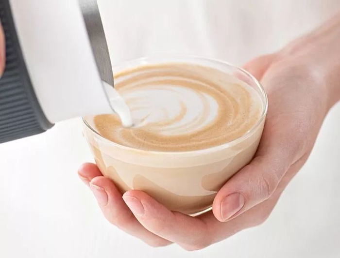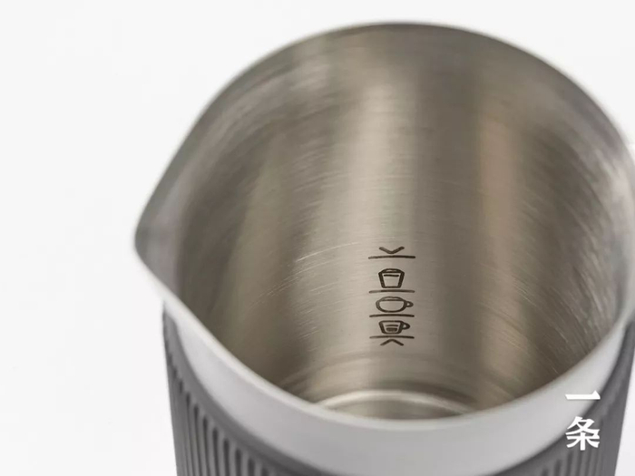 为了制作完美奶咖,按照奶泡壶内刻度倒入相应量的全脂奶,太多或者太少都不好。