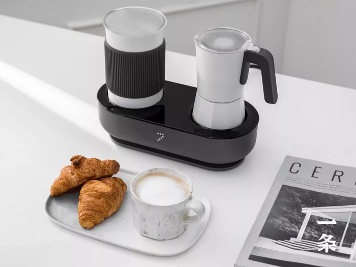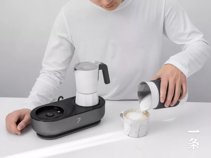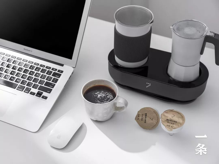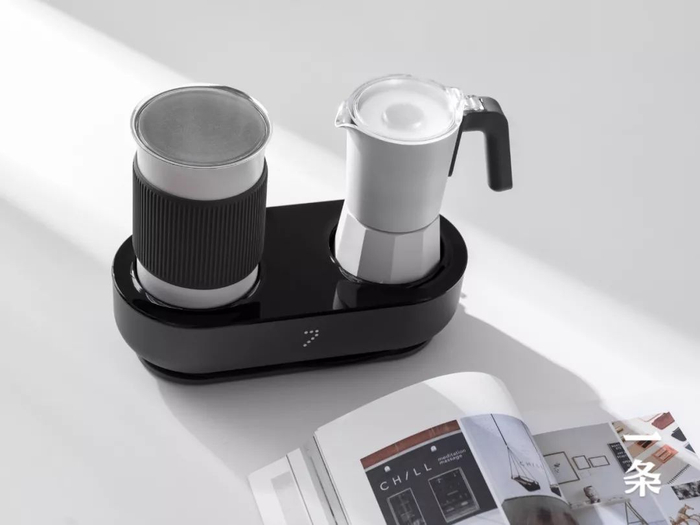 左边是奶泡机,右边是摩卡壶,一键启动。煮咖啡、打奶泡,同时完成。