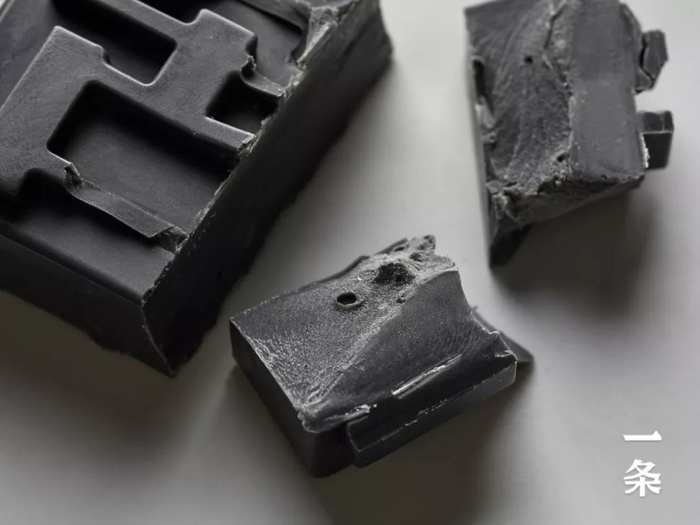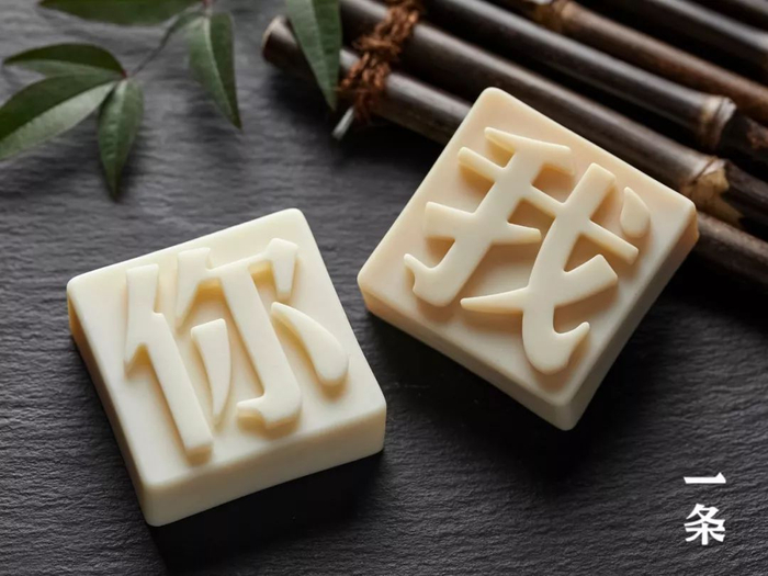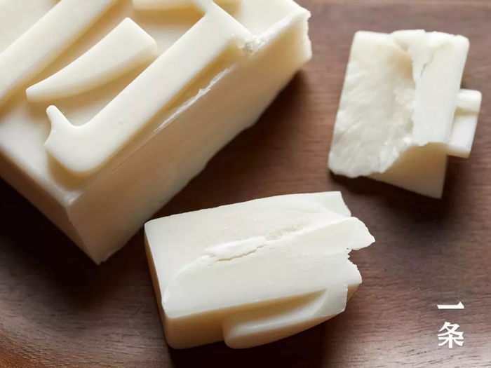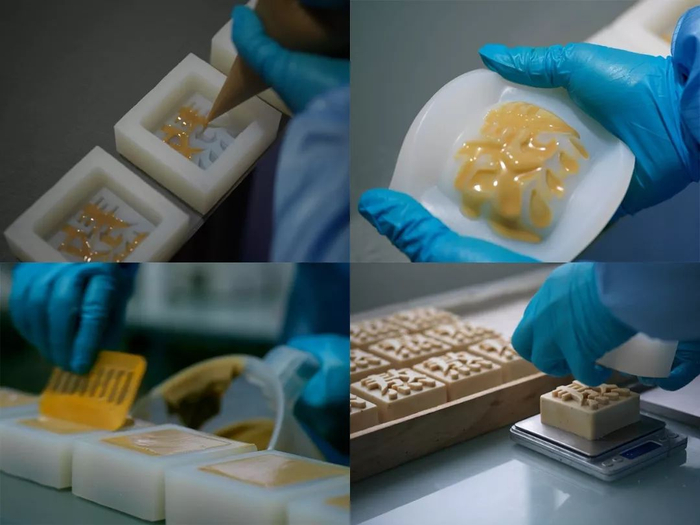 共18道必经的繁琐工序,皂液反复灌入字体模型4~6次,冷却后一块块手工细心脱模才能做到笔画清晰、线条流畅、无缺漏和气泡。