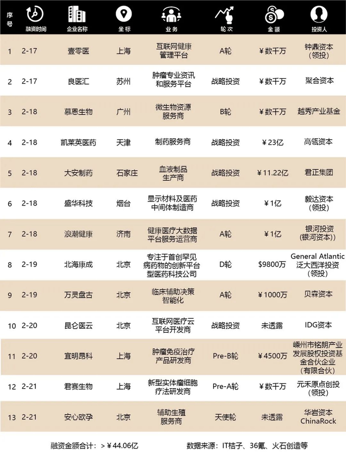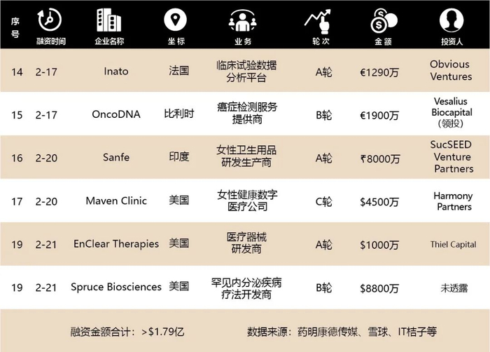 2020年2月17日至2月23日,全球范围内披露的医疗健康行业融资事件(VC/PE)共计19起,融资金额合计约56.62亿人民币。