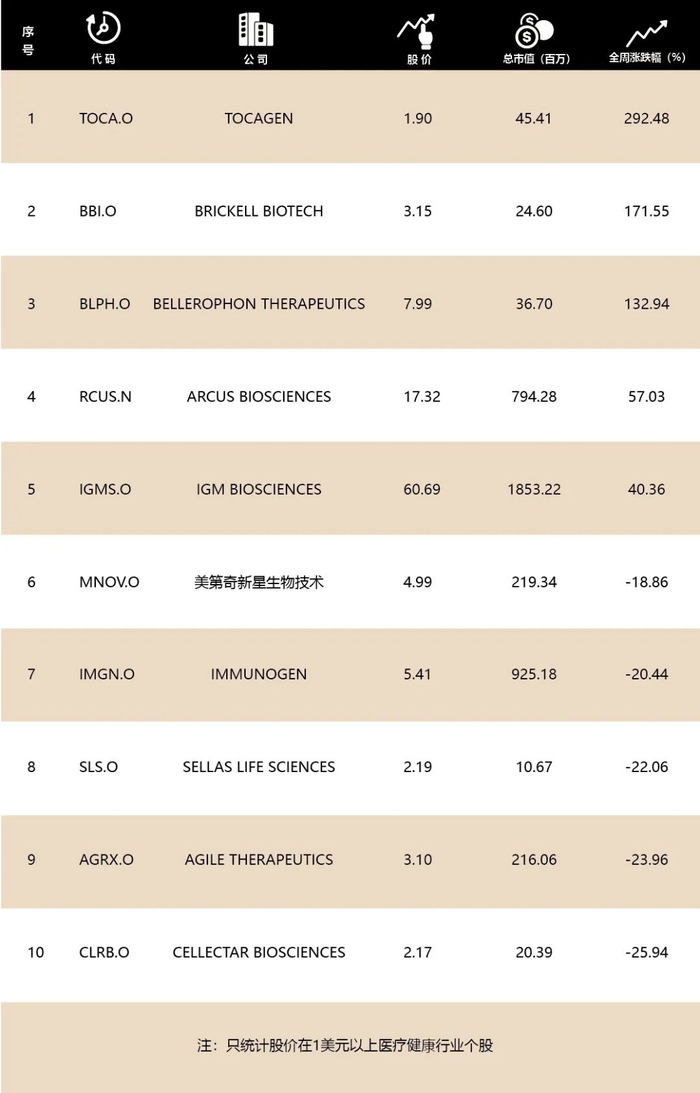 注:只统计股价在1美元以上医疗健康行业个股