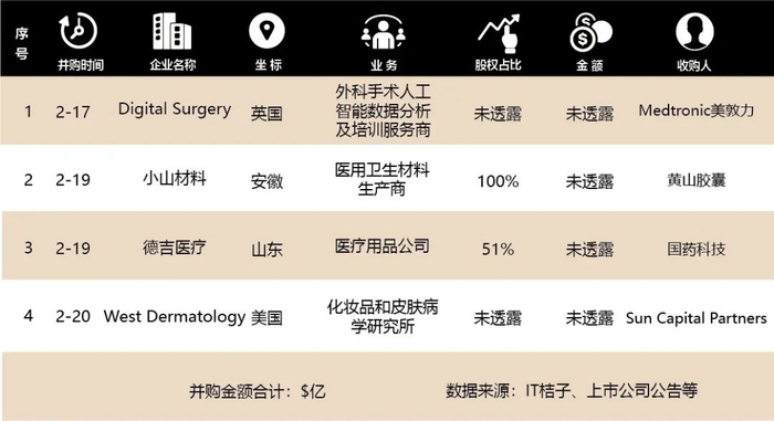 2020年2月17日至2月23日,全球范围内披露的医疗健康行业并购事件共4起。