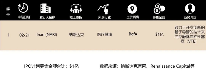 2月21日,Inari向SEC提交了一份首次公开发行募集资金1亿美元的S-1文件,计划在纳斯达克证券交易所上市,代码为NARI。