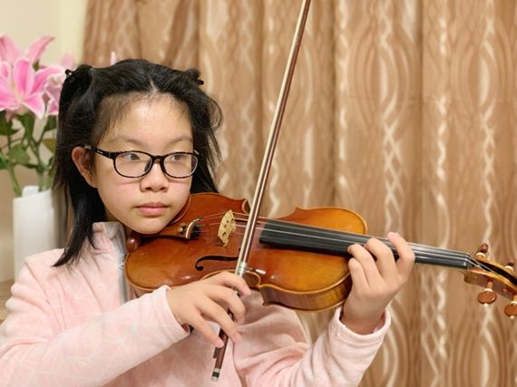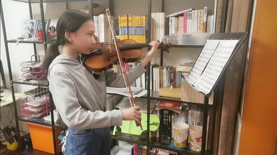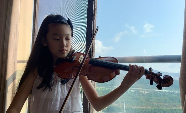 “疫情期间我和家人一直响应政府号召,足不出户,不过我们从2月初跟着学校的邮件节奏开始自我学习状态,涵盖学校所有课程,由于平时的游泳训练中断,不过每天的体能训练不间断,当然作为乐团的成员,每天小提琴的练习是必须的,音乐赋予这段特殊时期特别的陪伴。