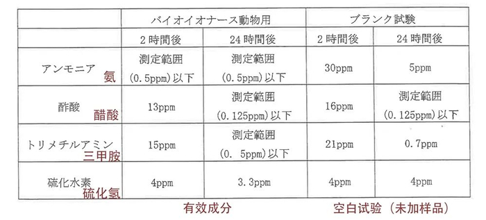 实验条件下,内含的有效成分能降低氨气、醋酸、三甲胺、硫化氢的浓度。