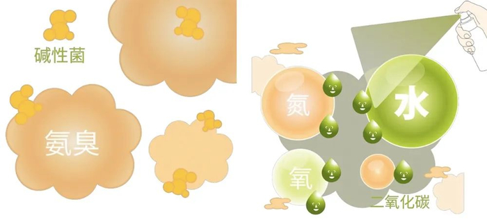 以氨气为例,有碱的特性,除菌成分里的酸性物质可以与它中和掉,最终分解臭味。